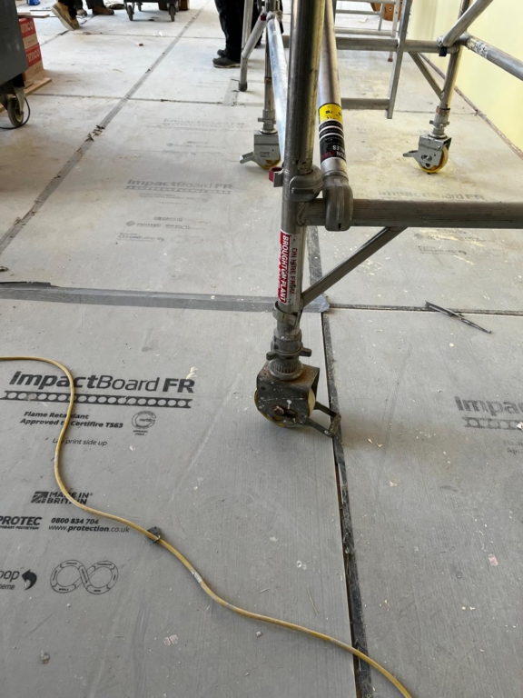 The primary challenge was protecting multiple flooring finishes from heavy footfall and equipment, including mobile towers, pallet trucks carrying heavy materials, and MEWPs. Certain areas required a heavier grade of protection to ensure the longevity of the newly installed surfaces. The protection also needed to be flame-retardant, waterproof, and lightweight while offering sustainability benefits.