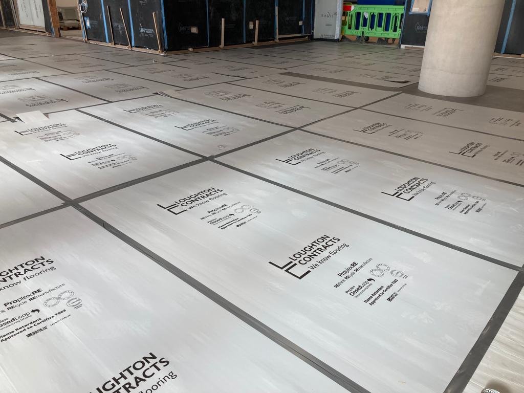 The project was a significant commercial development covering 18,155m² of floor space requiring extensive temporary protection for a variety of floor finishes, including herringbone timber, vinyl, carpet, latex, resin, and tiling. The site was a high-value, high-traffic environment, necessitating durable and sustainable solutions. Loughton Contracts are a longstanding partner of Protec and trust our expertise in providing high-performance protection solutions.